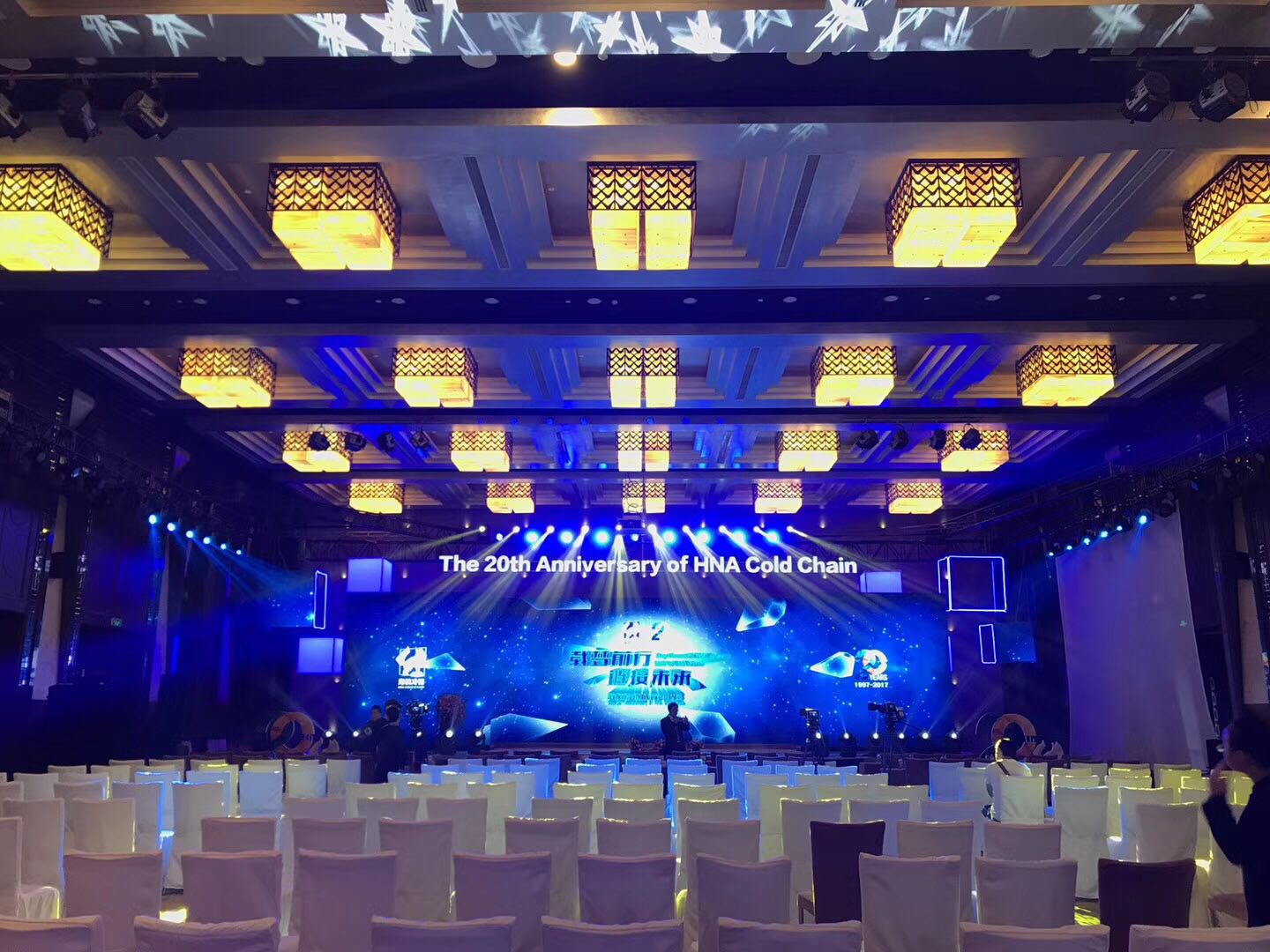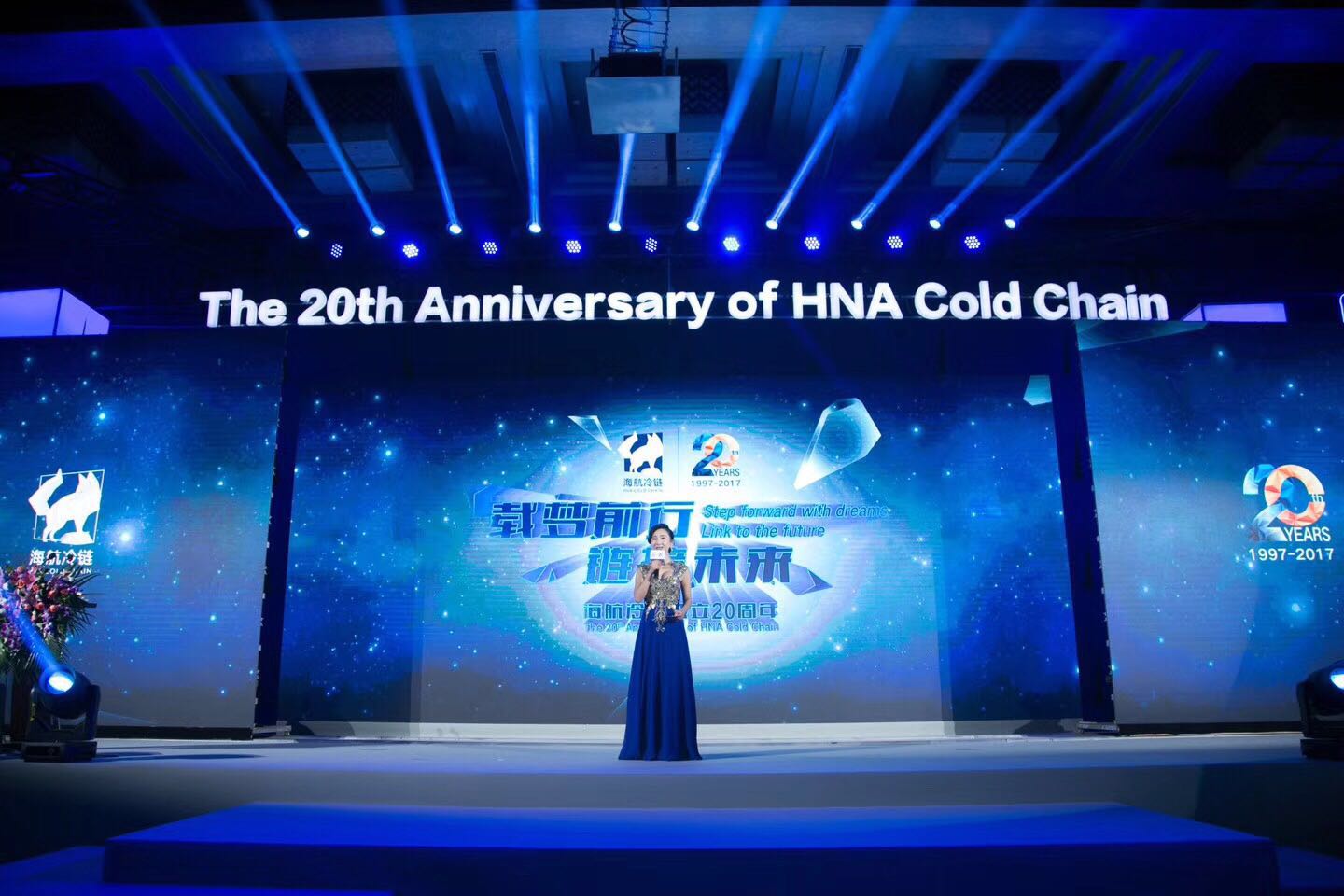 为创造一种生动活泼的立体演出效果,将传统的舞台摈弃,突出冷链集团在新时代下蓬勃发展的主题,采用科学蓝白,同时也寓意着有科学力量作为冷链的后盾,在今后的市场经济下有绝对的竞争力